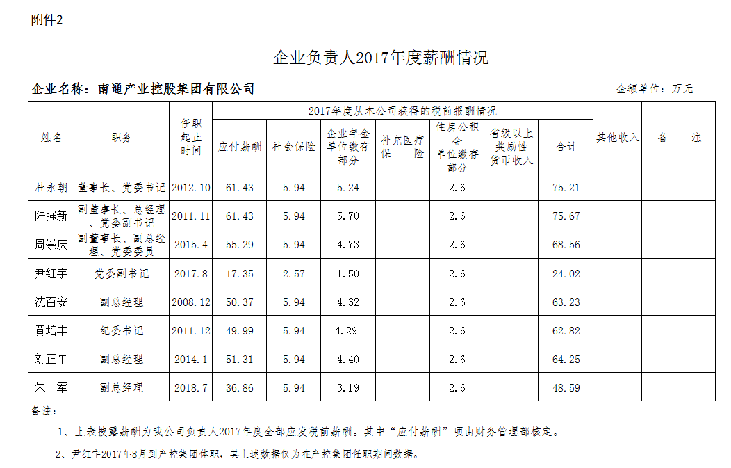 南通產(chǎn)業(yè)控股集團(tuán)有限公司2017年度薪酬信息披露公告
