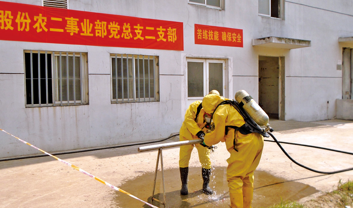6月6日下午農(nóng)一事業(yè)部雙甘膦分廠組織氨回收送農(nóng)二事業(yè)部液氨管道泄漏預(yù)案演練,事業(yè)部總經(jīng)理孟長春擔(dān)任演練總指揮。6月19日,I草丙班與雙甘膦丙班聯(lián)合進(jìn)行了液氨槽裝卸管道泄漏演練。演練前值長按照以往演練出現(xiàn)問題對原預(yù)案進(jìn)行了修改,并且進(jìn)行了泡沫消防炮、防化服穿戴專項(xiàng)訓(xùn)練。