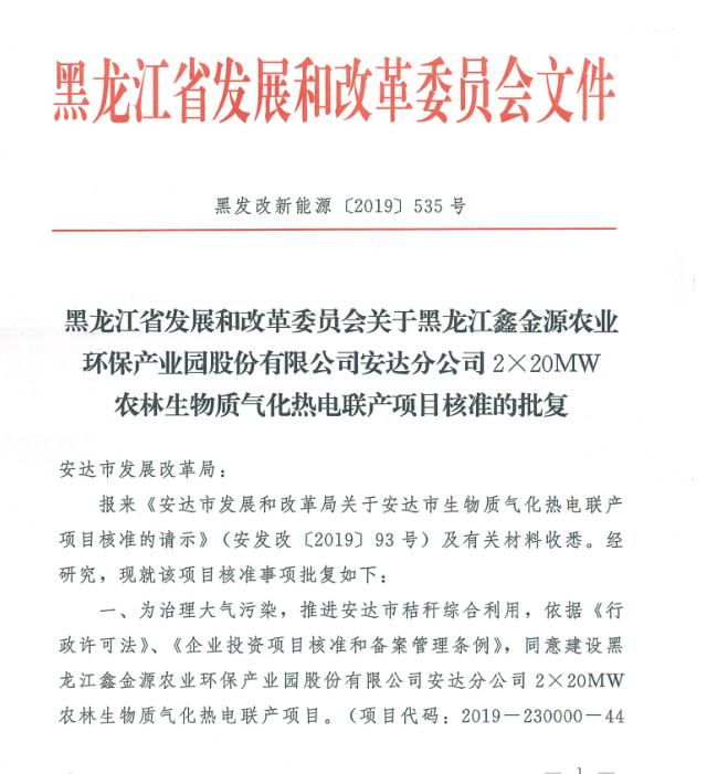 安達(dá)2×20MW農(nóng)林生物質(zhì)氣化熱電聯(lián)產(chǎn)項(xiàng)目 獲黑龍江省發(fā)改委核準(zhǔn)