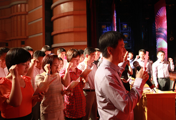 五年新跨越 歌聲獻(xiàn)給黨 ----集團(tuán)隆重舉行“七一”總結(jié)表彰大會(huì)暨文藝匯演活動(dòng) 6月30日下午,產(chǎn)控集團(tuán)召開“七一”紀(jì)念表彰大會(huì)暨大型文藝匯演活動(dòng)。集團(tuán)所屬20家黨組織、近千名黨員參加活動(dòng),回顧黨的光輝歷程和“十一五”發(fā)展成果,以昂揚(yáng)的歌聲表達(dá)對黨的熱愛。市國資委李桂順主任、市委組織部宋建宏處長應(yīng)邀出席,集團(tuán)黨委副書記徐憲華主持大會(huì)。 大會(huì)表彰了2010年度“五好”黨組織、優(yōu)秀黨員和優(yōu)秀黨務(wù)工作者,以及在“創(chuàng)先爭優(yōu),實(shí)現(xiàn)跨越發(fā)展”暨慶祝建黨90周年系列活動(dòng)中涌現(xiàn)的先進(jìn)集體和個(gè)人。全系統(tǒng)20多名新黨員面向黨旗進(jìn)行入黨宣誓,與會(huì)黨員重溫了誓詞。 集團(tuán)黨委書記、董事長陳照東代表黨委作報(bào)告。他指出,全市經(jīng)濟(jì)社會(huì)發(fā)展已進(jìn)入“兩個(gè)率先”的關(guān)鍵時(shí)期,產(chǎn)業(yè)現(xiàn)代化是市委確定的三大目標(biāo)之一,產(chǎn)控集團(tuán)要成為產(chǎn)業(yè)現(xiàn)代化的生力軍。他要求,圍繞“十二五”期末實(shí)現(xiàn)總資產(chǎn)、銷售額“雙兩百億”的目標(biāo),各級黨組織要引領(lǐng)科學(xué)發(fā)展,統(tǒng)籌謀劃發(fā)展思路、發(fā)展戰(zhàn)略,重點(diǎn)加 快洋口港新城、觀音山新城和生物科技園的新興產(chǎn)業(yè)建設(shè)和傳統(tǒng)產(chǎn)業(yè)的優(yōu)化升級;全體黨員要爭做先鋒模范,以企為家,立足崗位,創(chuàng)新、敬業(yè)、奉獻(xiàn);通過建設(shè)學(xué)習(xí)型黨組織,加強(qiáng)人才引進(jìn)和培養(yǎng),積極推進(jìn)民主管理,加強(qiáng)反腐倡廉建設(shè),以創(chuàng)先爭優(yōu)為主題創(chuàng)新黨建工作內(nèi)涵,圍繞深化改革、加快發(fā)展、維護(hù)穩(wěn)定的大局提供 堅(jiān)強(qiáng)的政治和組織保障,為集團(tuán)實(shí)現(xiàn)新的跨越保駕護(hù)航。 大會(huì)在雄壯的《國際歌》歌聲中結(jié)束。會(huì)后,以“黨旗輝映產(chǎn)控情”為主題的大型文藝匯演隆重上演,產(chǎn)控系統(tǒng)十家單位選送了精彩的歌舞、小品、詩朗誦等節(jié)目,贏得陣陣喝彩,向社會(huì)展現(xiàn)了產(chǎn)控人“齊心向黨、追求跨越”的嶄新風(fēng)貌。
